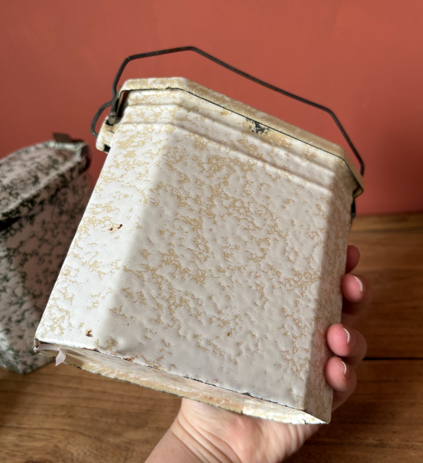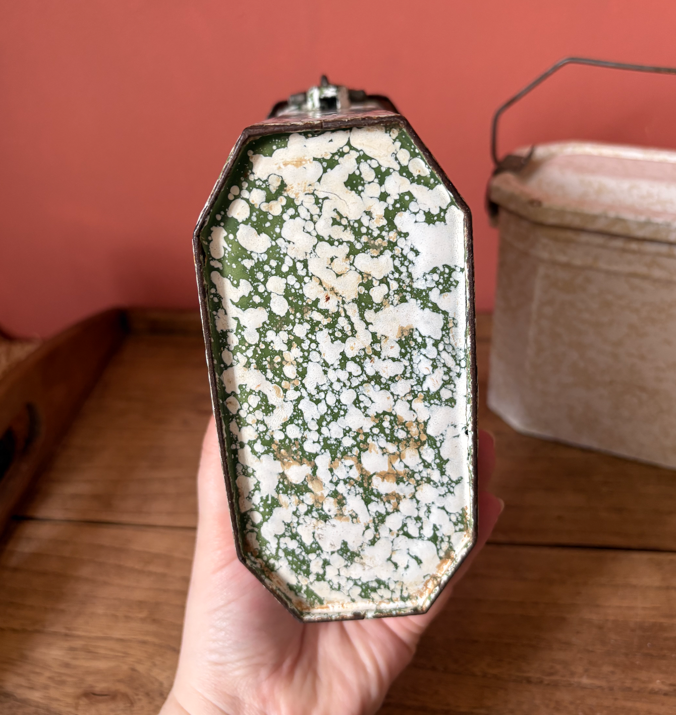Green 2. Lovely Green colour with white splatter effect inside and out. Does not have a metal top tray.