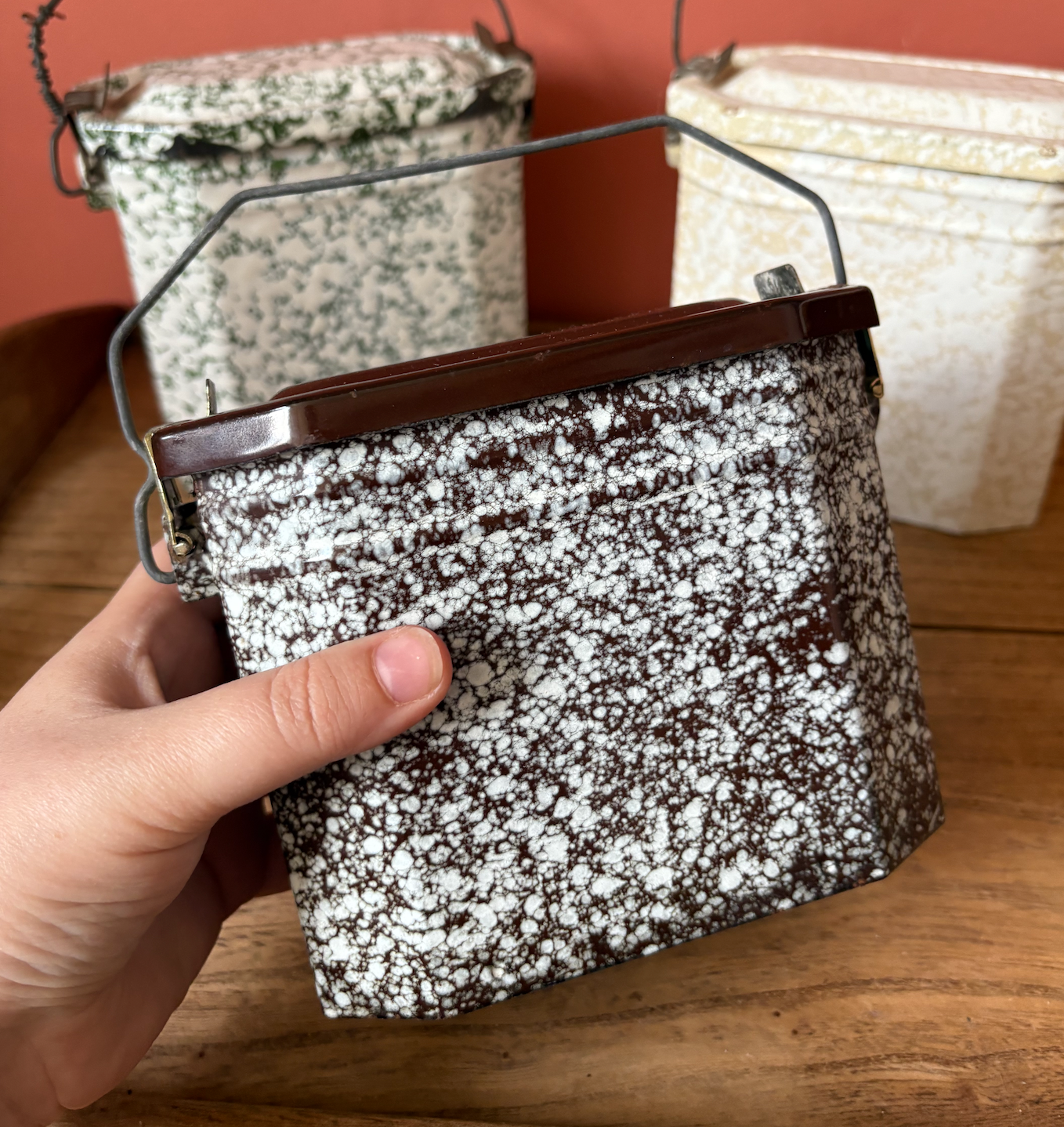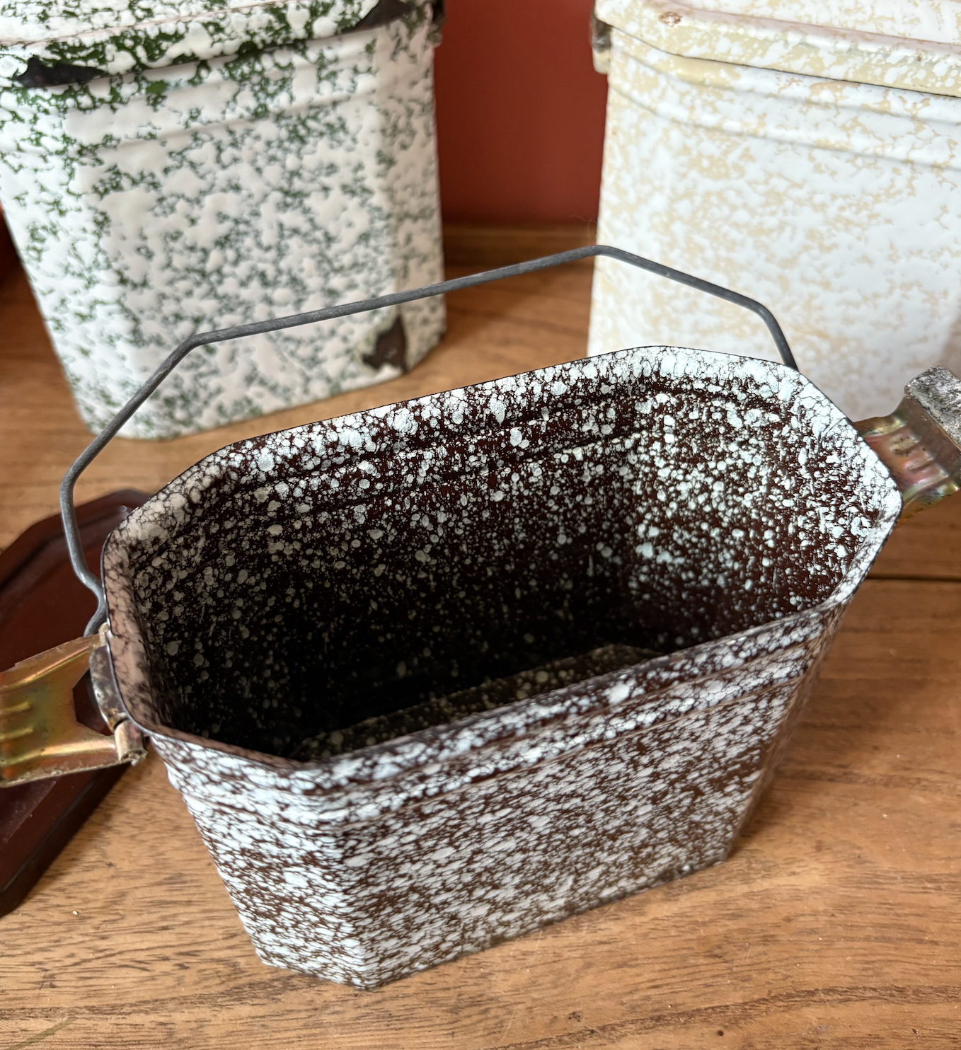 Brown 1. Slightly smaller than the other two. It has a silver top tray for dry items. Solid brown top and lovely splattered pattern all the over the rest.