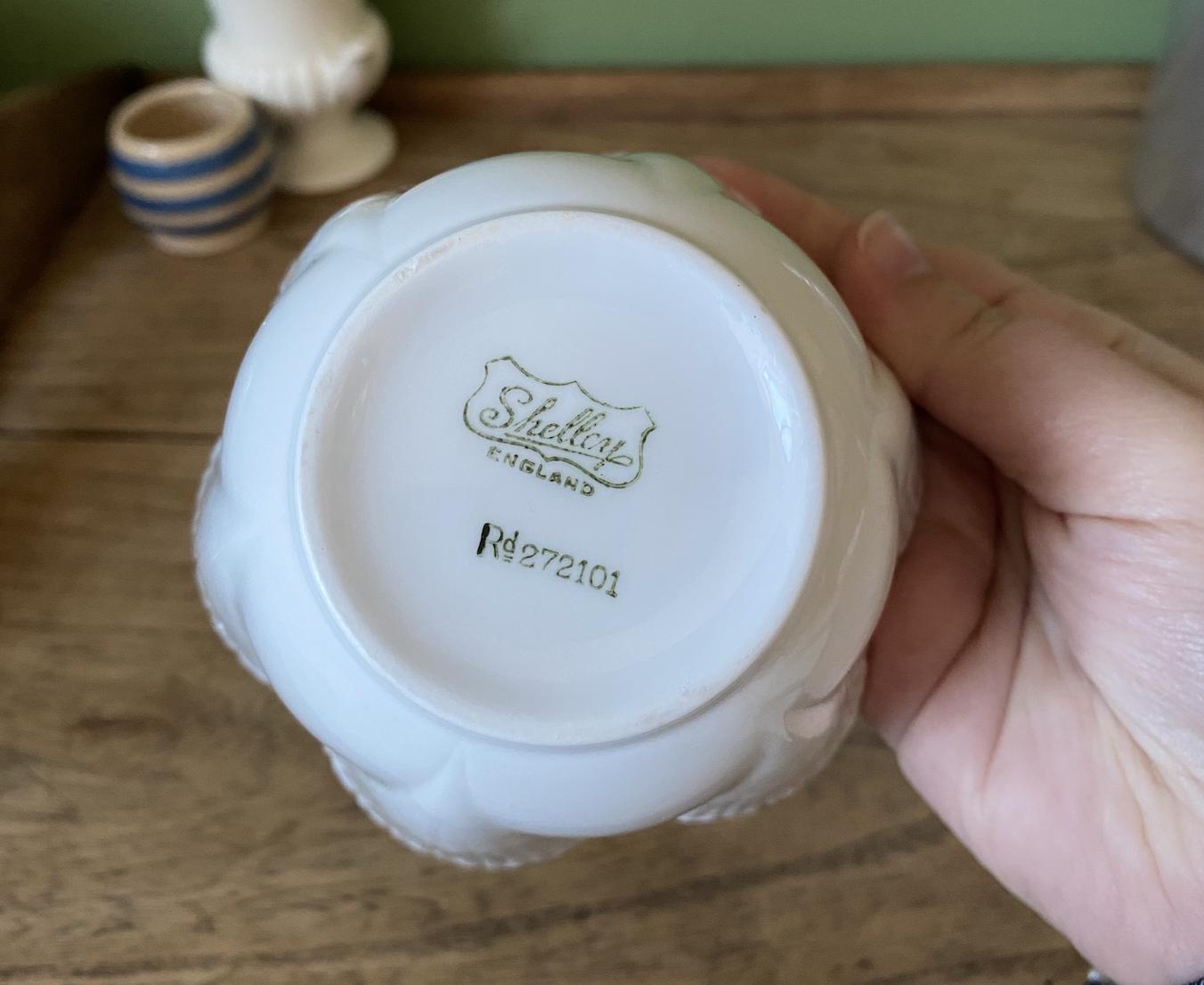 Lovely set of afternoon tea-ware. Dainty pattern, all white with a beautiful shape. Each stamped with Shelly on the underside.