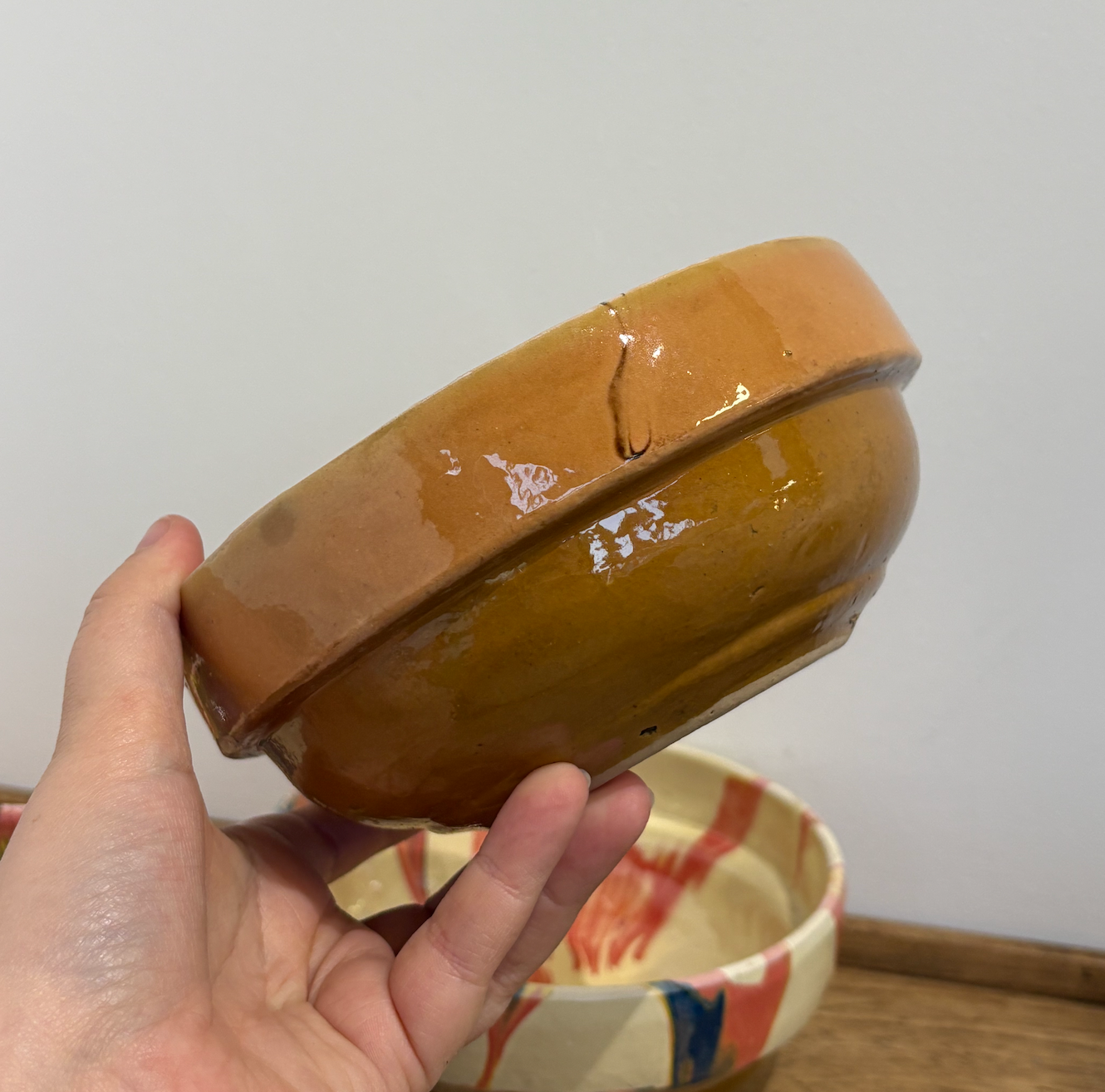 Condition: This are handmade artisan items no two are the same and each has signs of the making process, glaze bumps and some flaking in the glaze at the rim most likely. Any chips or damage will be mentioned if there is any - the orange bowl has a chip to the outside, photography.